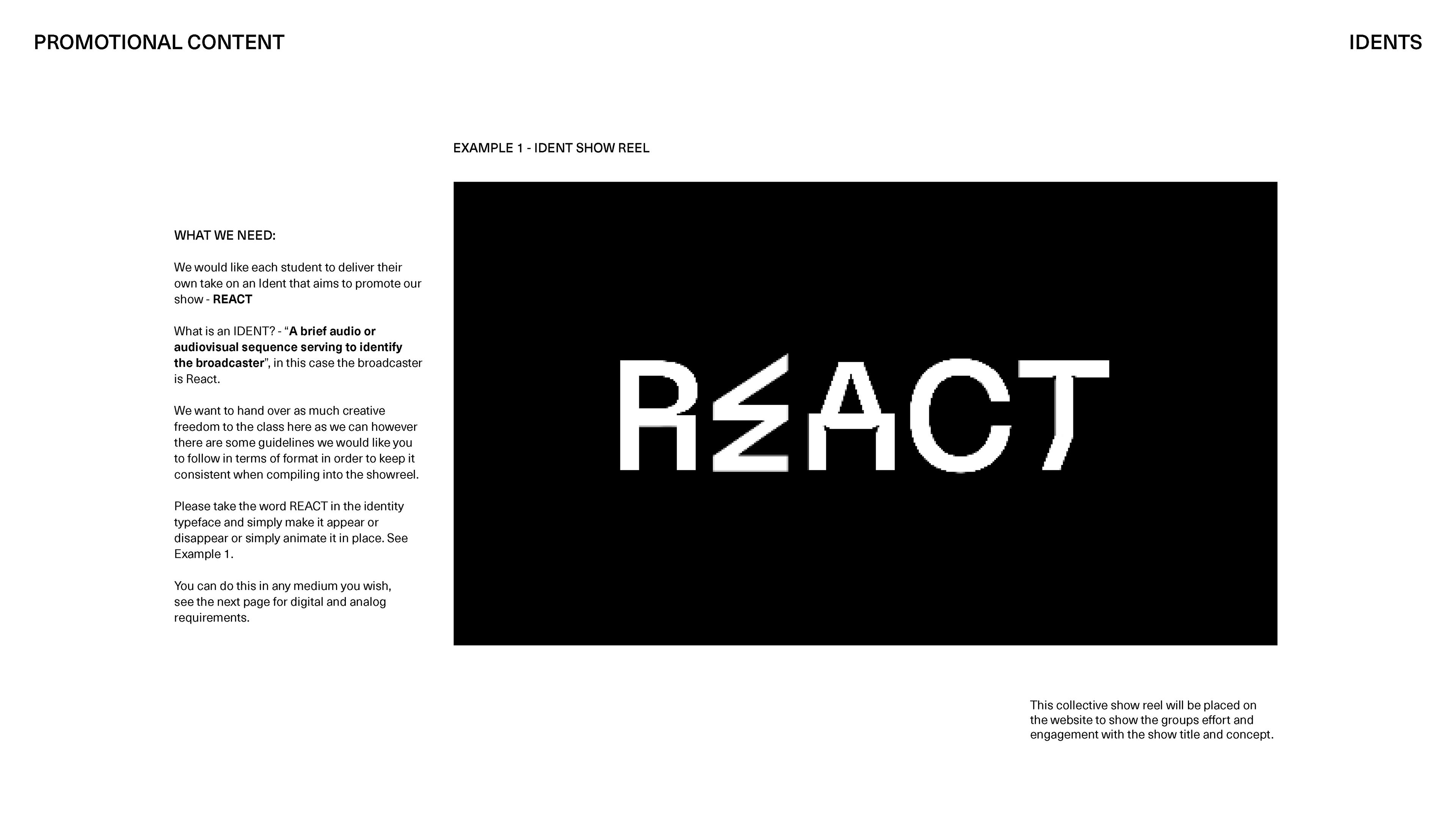 Above is an example of one of the presentations asking the students for their response to a brief in which we required them to make an ident to create a larger showreel.