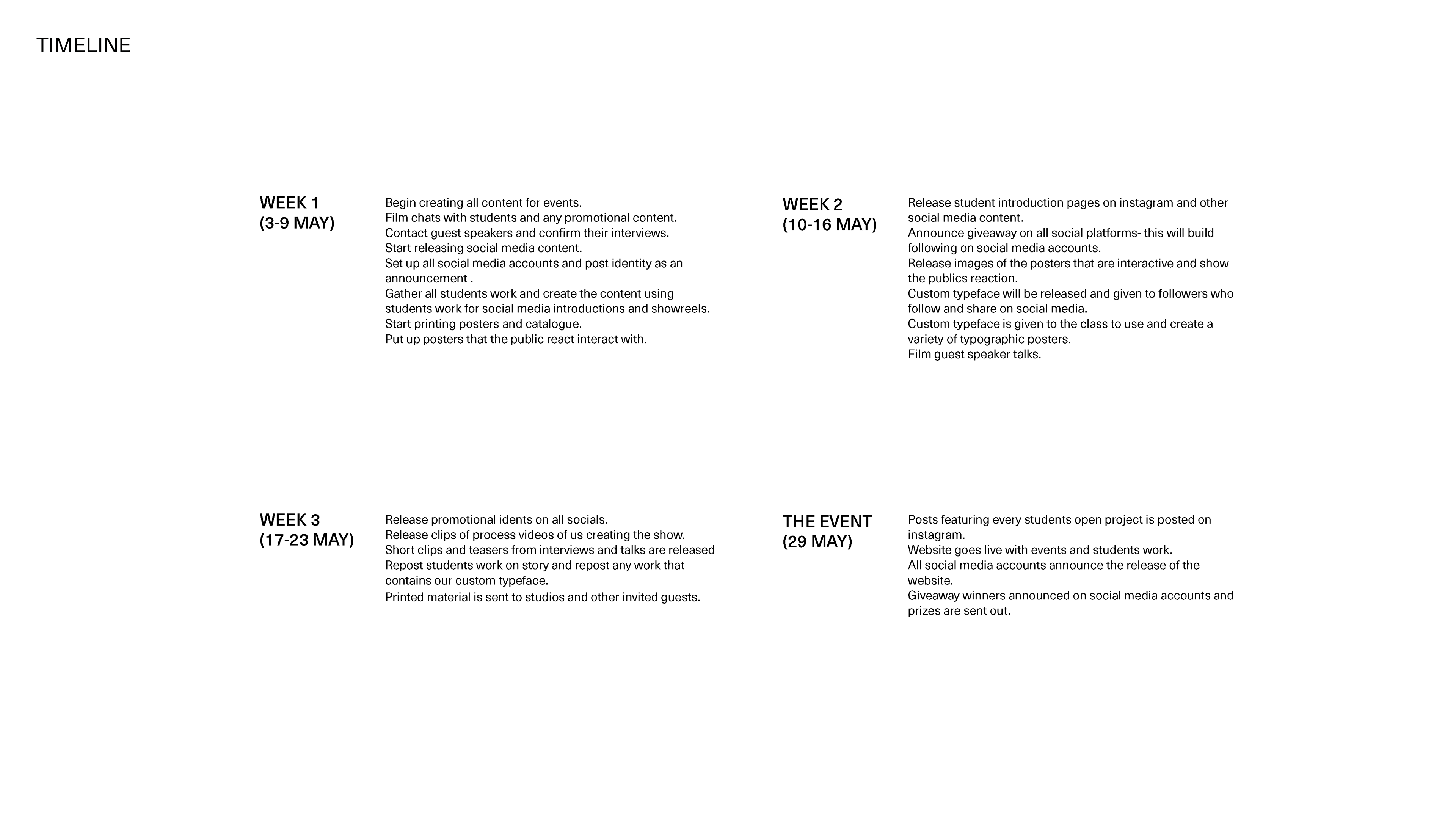 I made various presentations for the class in the following weeks to ensure we stuck to our timeline and collected all relevant assets from the class group. I played a huge role in managing these assets and communicating with the class about what was required.